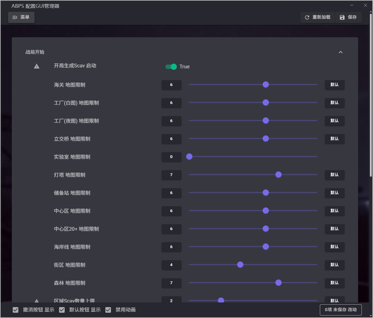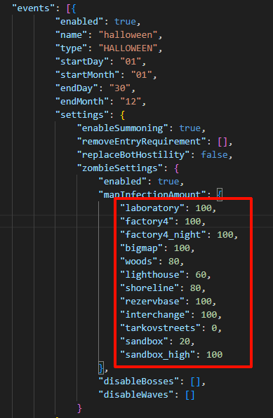 每个地图的丧尸概率: - 实验室:100% - 工厂日/夜:100% - 海关:100% - 森林:80% - 灯塔:60% - 海岸线:80% - 储备站:100% - 立交桥:100% - 街区:0% - 中心区:20% - 中心区(高级):100% 如想修改以上数据,请修改这个文件: